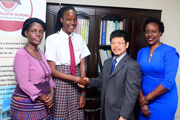 Deputy Japanese Ambassador to Uganda Mizumoto Horii congratulates Akankunda Daniela as the Director of Viva College school Ms Faridah Kisaame (Left) and her mother Jill Kyatuhaire (Right) looks on at the Embassy of Japan during the flag off ceremony.