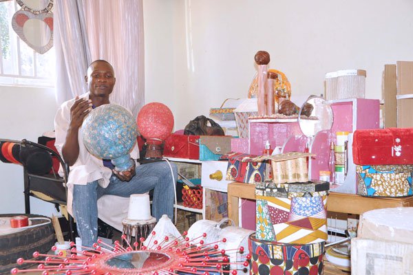 Mr Michael Isaac Kuteesa, founder La Craft Uganda shows a lamp shade made from waste materials. Currently, production remains confined to his sitting room in Manyangwa. Photo by Eronie Kamukama monitor.co.uug