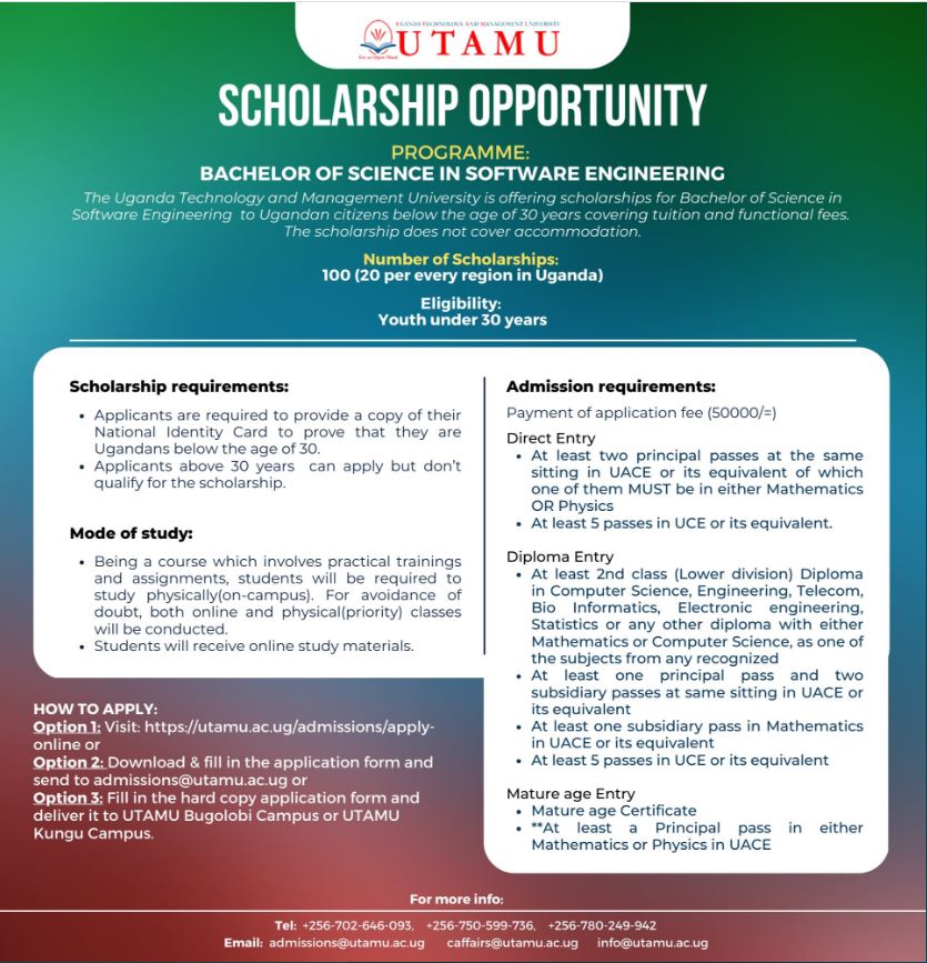 The Uganda Technology and Management University is offering scholarships for a Bachelor of Science in Software Engineering to Uganda Citizens below the age of 30 years covering tuition and functional fees. The tuition doesn't cover accommodation
