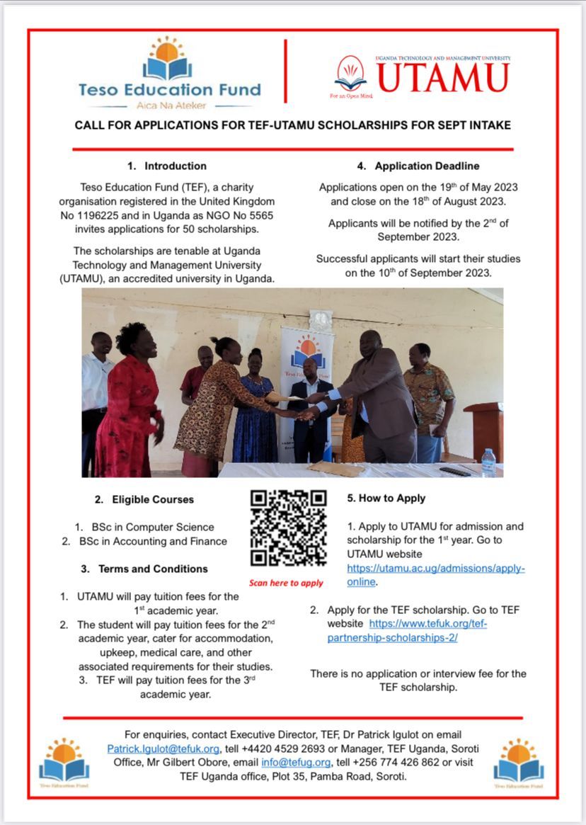 TESO Education Fund (TEF), A Charity Organization registered in the United Kingdom No 1196225 and in Uganda as NGO No 5565 invites applications for 50 Scholarships