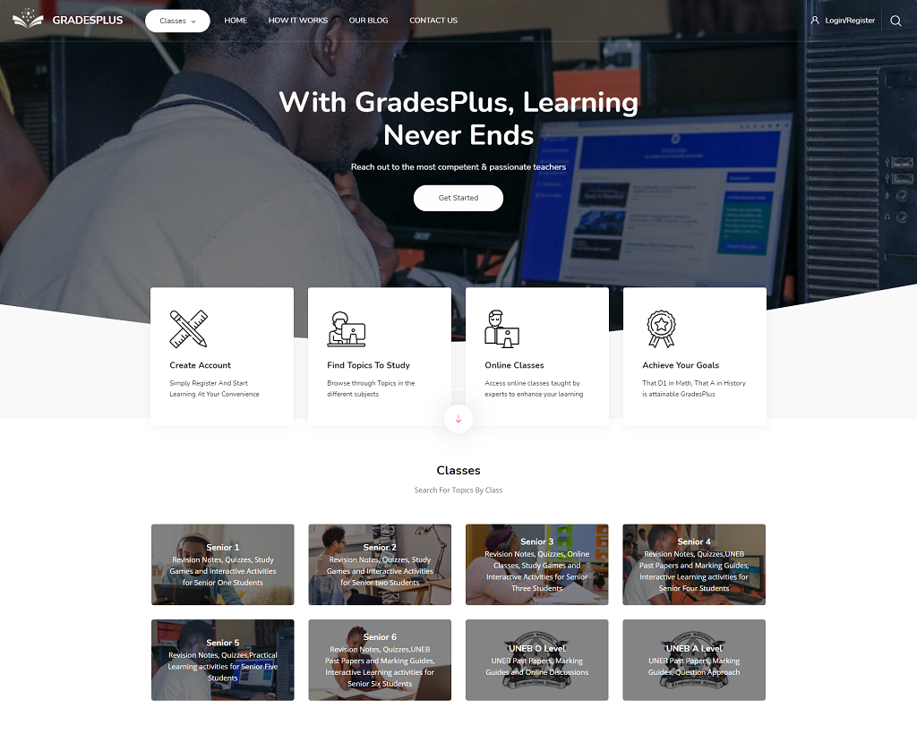 Grades Plus Academy is a platform where students find notes in all Subjects, Topical tests,UNEB Past Papers with Marking Guides and Online Labs. With Grades Plus, You Learn Anytime, Any Where. We offer the following